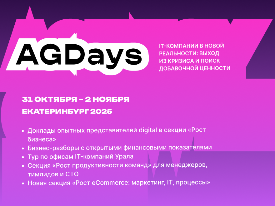 С 31 октября по 2 ноября в Екатеринбурге пройдёт AGDays — ежегодную конференцию про рост eCommerce, IT-бизнеса и продуктивности команд.